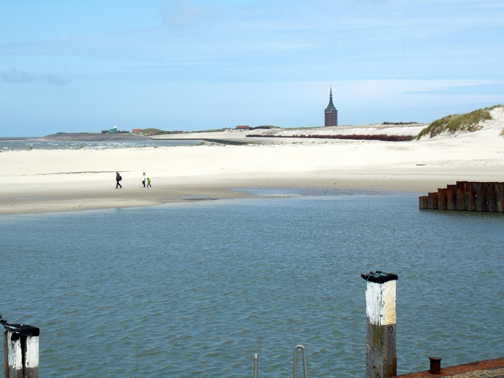 Das nördliche Hafenbecken des Anlegers, in der Bildmitte sehen wir eine Familie auf Spaziertour, im Hintergrund die Harle Hörn-Dünen.