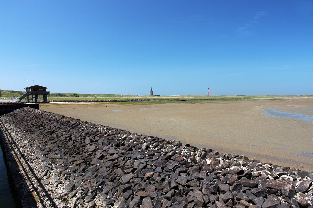 Die Nordseite des Westanlegers wird durch einen Steindamm begrenzt. Links sehen Sie die Schiffsmeldestelle, rechts daneben das Wattenmeer bei Niedrigwasser und ganz hinten den Westturm und den Neuen Leuchtturm.