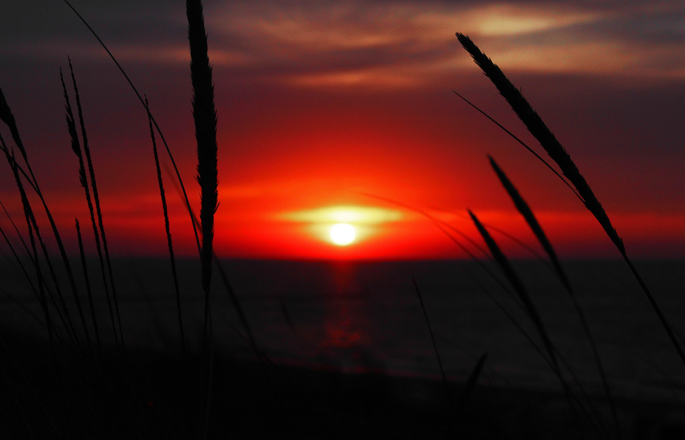 Im Vordergrund hebt sich der Strandhafer, der an der Strandpromenade wächst, schwarz von der untergehende Sonne ab.