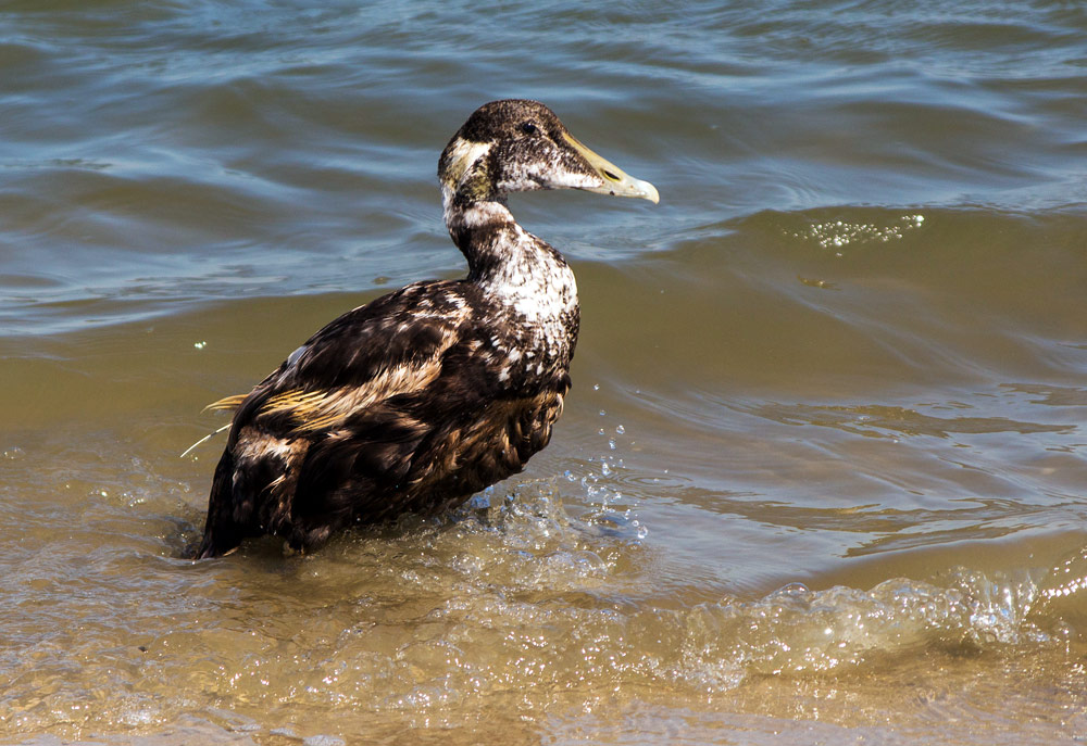 Eine männliche Eiderente (Somateria mollissima) watschelt an der Wasserkante entlang. Sie trägt hier nicht ihr sonst auffälliges schwarz-weißes Prachtkleid, sondern ist im sogenannten »Schlicht-« oder »Ruhekleid« unterwegs.