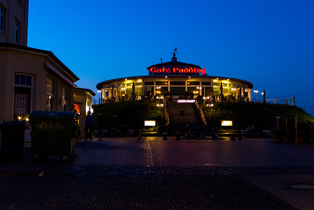 Am nördlichen Ende der »Zedeliusstraße« befindet sich auf einer ehemaligen Düne ein rundes Lokal namens »Café Pudding«. Hier sehen wir es beleuchtet in der Abenddämmerung.