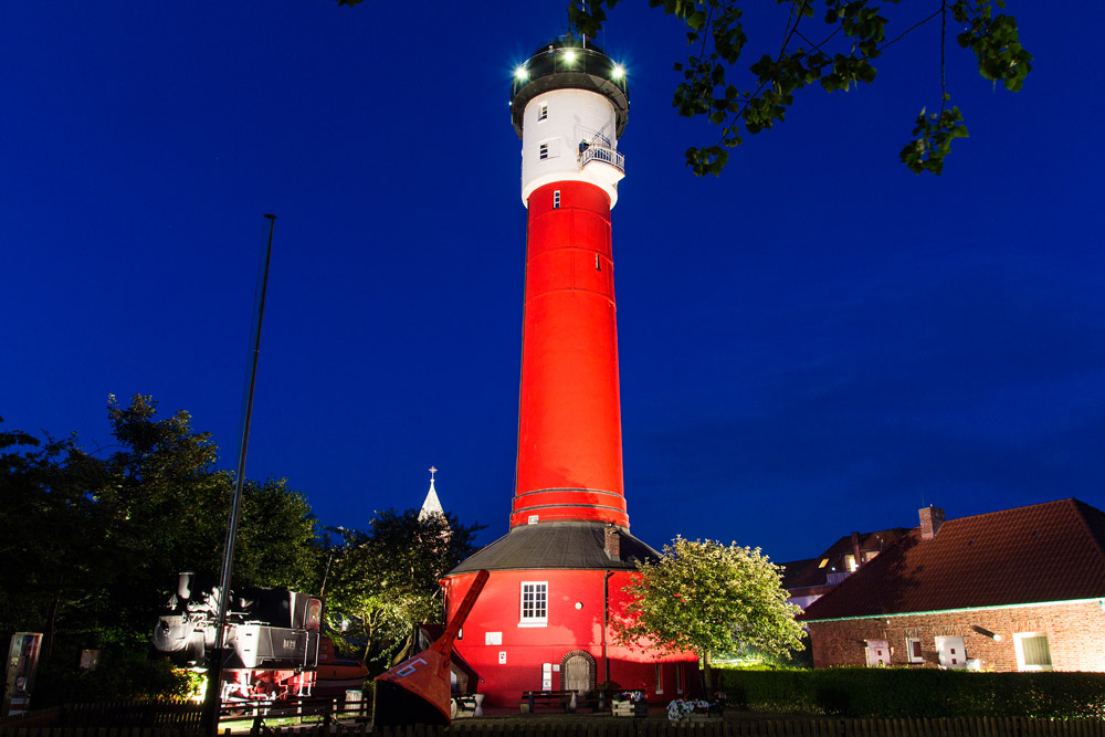 Noch ist ein wenig Resthelligheit im Himmel vorhanden, doch es wird nun von Minute zu Minute dunkler. Wunderbar hebt sich der rot und weiß gestrichene, angestrahlte Alte Leuchtturm vom dunkelblauen Himmel ab. Unten links ist ferner die ehemalige Inselbahn-Lokomotive »99 211« erkennbar.