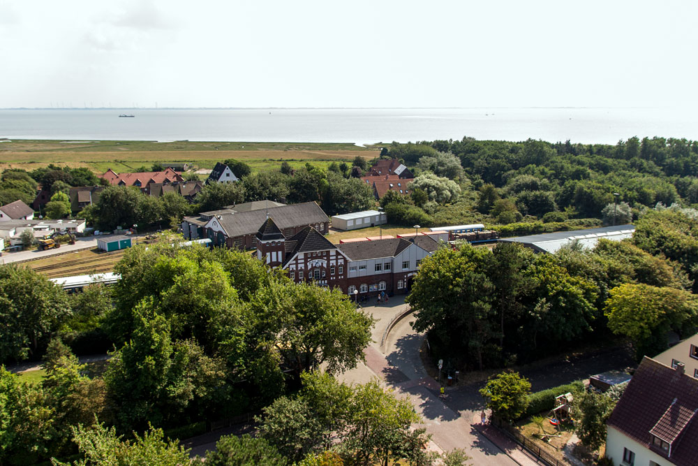 Ein Blick von der Turmspitze des Alten Leuchtturms nach Süden. Am Ende der »Zedeliusstraße« befindet sich der Bahnhof, ein Teil der Gleisanlagen ist hinter dem Bahnhofsgebäude zu erkennen. Im Hintergrund sehen Sie das Wattenmeer bei Hochwasser.