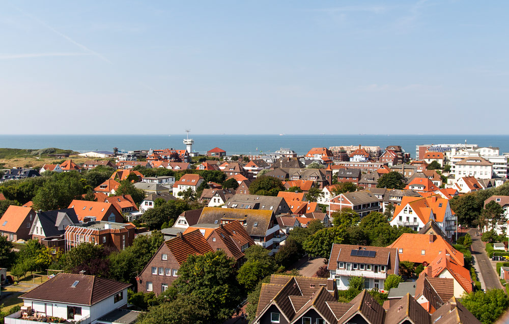 Vom Leuchtturm aus kann man wunderbar das gesamte Dorf überblicken. Hier lassen wir die Blicke nach Nordwesten schweifen und erkennen zahlreiche rot-braun gedeckte Häuser sowie ganz im Hintergrund das Schwimmbad und die Marine-Signalstation, das in Bau befindliche neue Aparthotel »Anna Düne« und ganz rechts die »Robbenstraße«.