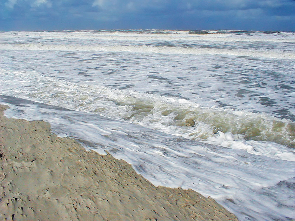 Das vorüberziehende Sturmtief brachte kräftige Mittelwinde und Böen mit sich, die mit einer spätsommerlichen Sturmflut einhergingen. Gut erkennt man hier, wie die Wellen an der (noch) kleinen Abbruchkante nagen, indem sie Sand aufwühlen und die Kante so fortlaufend vergrößern.