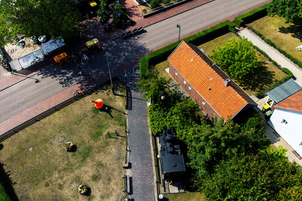 Die »Zedeliusstraße« vom Alten Leuchtturm aus gesehen. Links oben ist der Bauzaun einer kleinen Baustelle zu sehen, die Bauarbeiten ruhen allerdings den gesamten Sommer über, erst ab Herbst darf auf Wangerooge wieder gebaut werden.