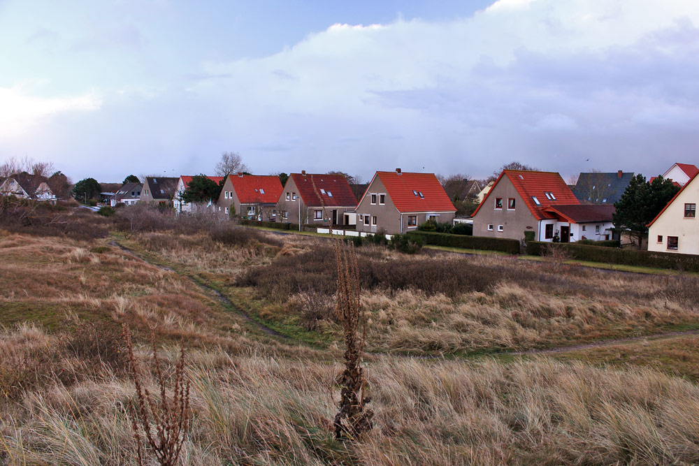 Nördlich der »Siedlerstraße« befindet sich eine unbebaute Dünenlandschaft mit einigen Erhebungen, unter denen sich alte Weltkriegsbunker befinden. Hier ein Blick auf die kleinen Häuser an der »Siedlerstraße«, die zwischen den Kriegen erbaut wurden.