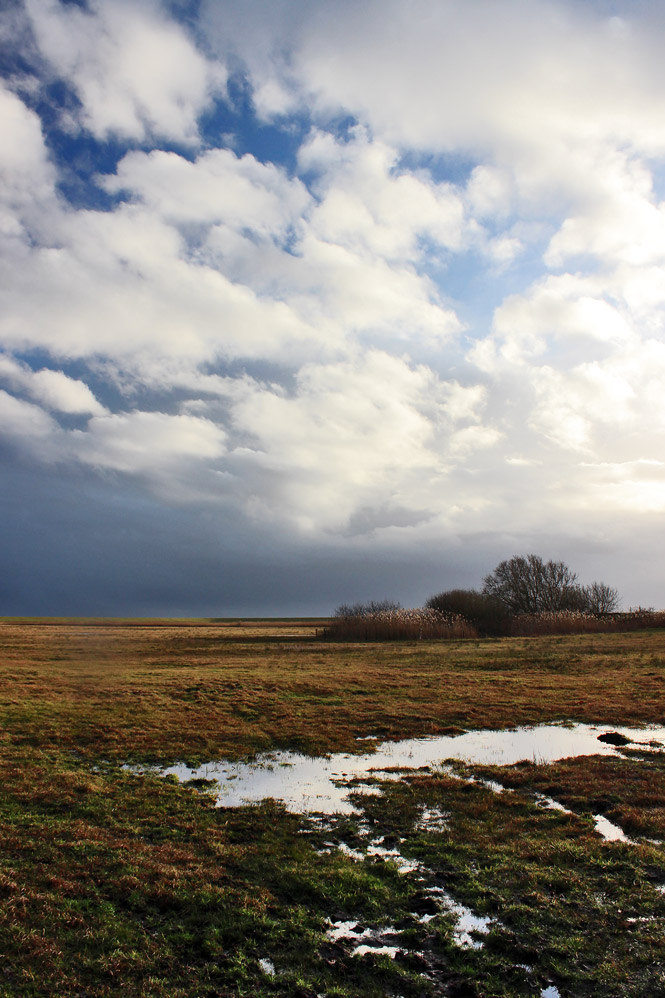 ‹ Interessante Winterwolken ziehen über die Insel hinweg. Während sie über dem Fotostandort aufgelockert sind, sind sie über dem Festland deutlich dunkler.