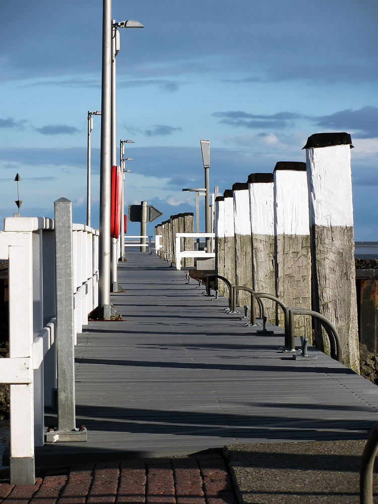 ‹ Dieser Steg besteht aus grauen Kunststoffplatten, er führt zum Schwimmsteg des »Wangerooger Yacht Clubs« sowie zum Gästesteg.