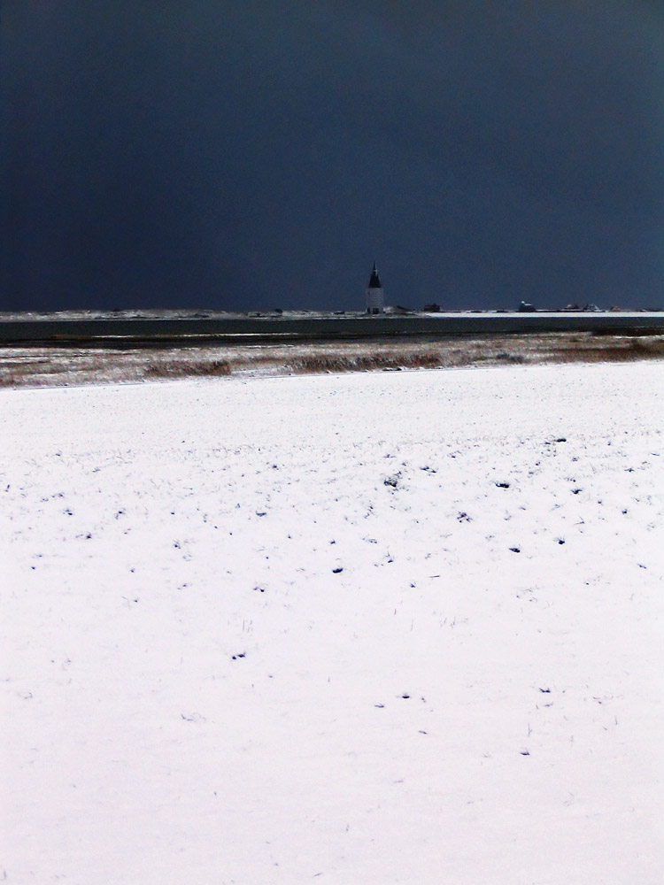 ‹ Dunkle Schneewolken nähern sich schnell aus westlicher Richtung, in wenigen Minuten dürfte es los gehen… Hier ein Blick auf das Deichvorland, die »Salinebucht« und das »Harle Hörn«.