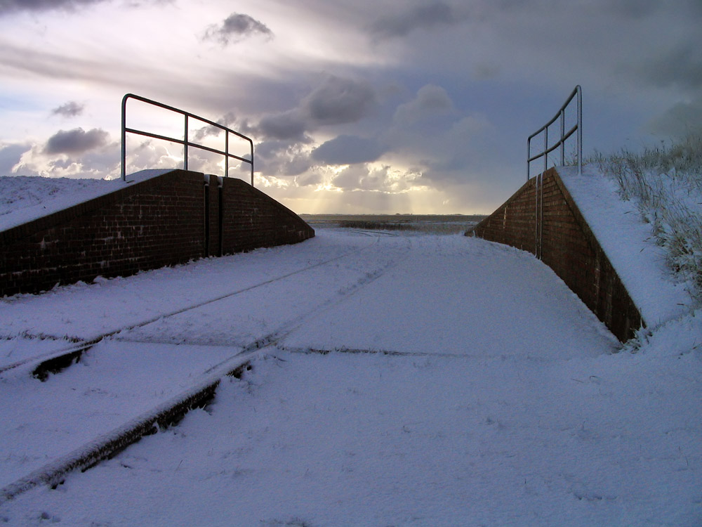 Der Süddeich wird hier in der Nähe der Müllpreßstation durch ein flaches Deichschart unterbrochen, durch welches die Müllzüge zum Westanleger hindurch fahren können.