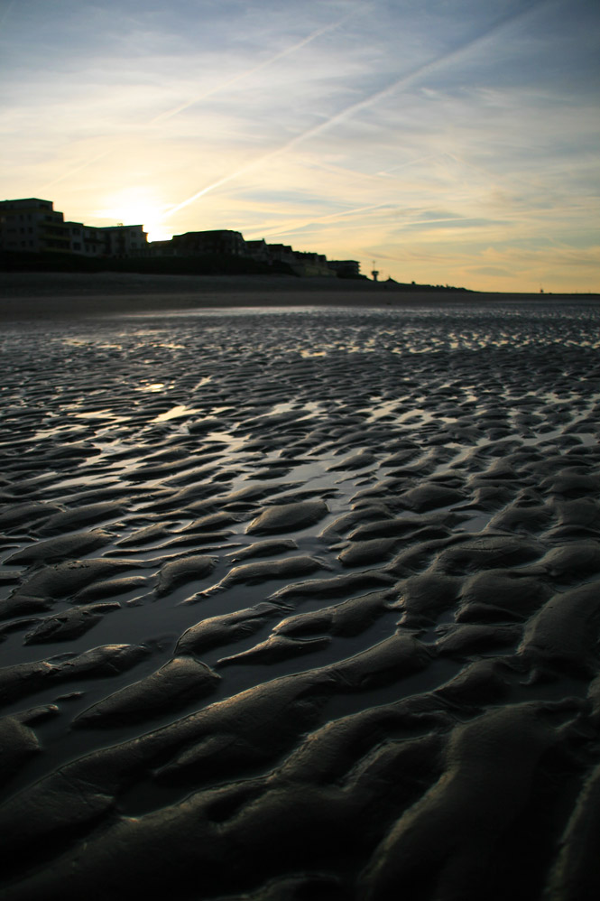 ‹ Das Licht der tiefstehenden Sonne spiegelt sich in den kleinen Pfützen zwischen den Sandrippeln, bald wird es zu dämmern beginnen.