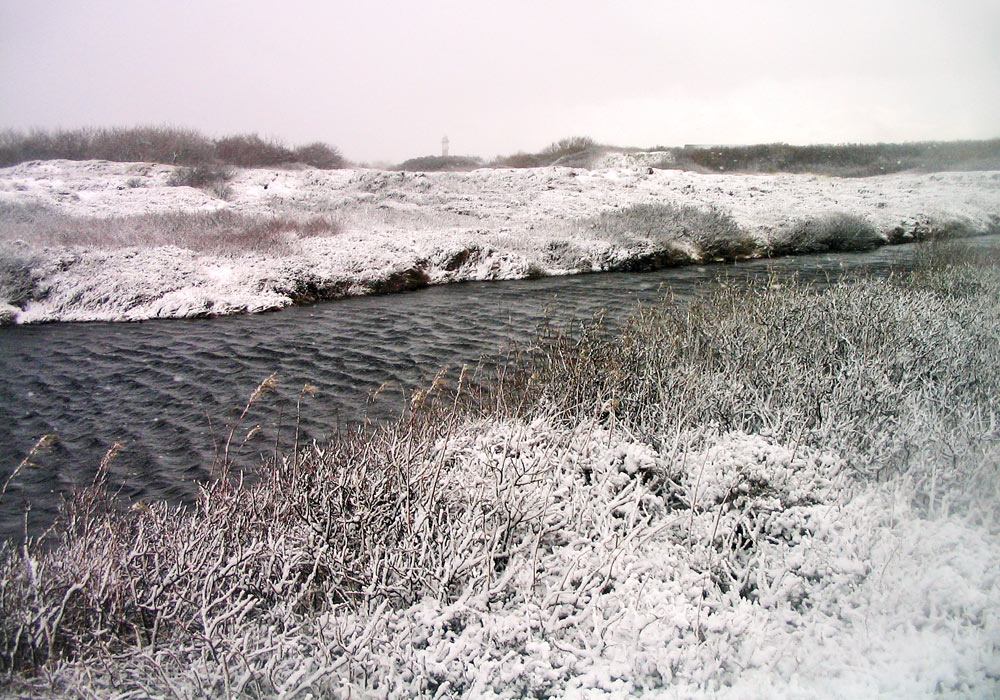 Die Ränder der »Eiskuhlen« sind von Schnee bedeckt und es beginnt langsam, noch etwas stärker zu schneien, dazu bläst ein kräftiger Wind. Auch der Alte Leuchtturm ist in etwa in der Bildmitte auszumachen.