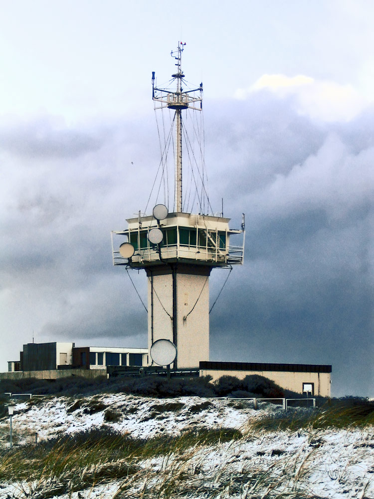 ‹ Hoch oben auf den Dünen befindet sich die Signalstation der Bundesmarine mit zahlreichen Richtfunk-Antennen. Dahinter ist das obere Stockwerk des »Kurhauses« zu sehen, welches im Jahr 2006 abgerissen wurde – heute befindet sich dort der »Platz am Meer«.