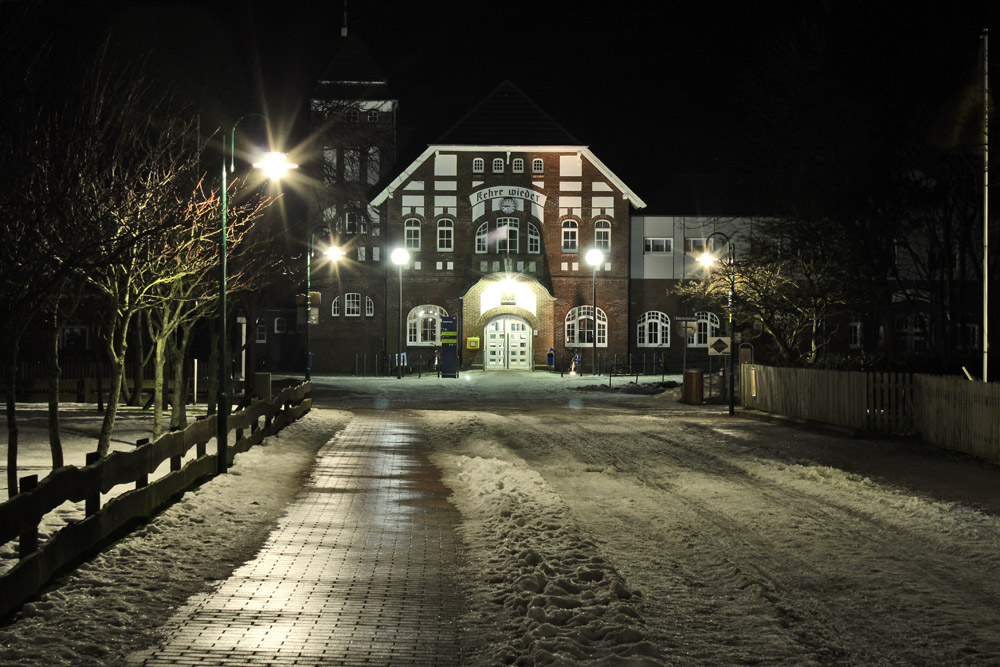 Winter auf Wangerooge – die »Zedeliusstraße« wurde hier bei Nacht bzw. am Abend abgelichtet. Dazu eine festgefahrene Schneedecke, die Bürgersteige wurden allerdings vorbildlich geräumt.