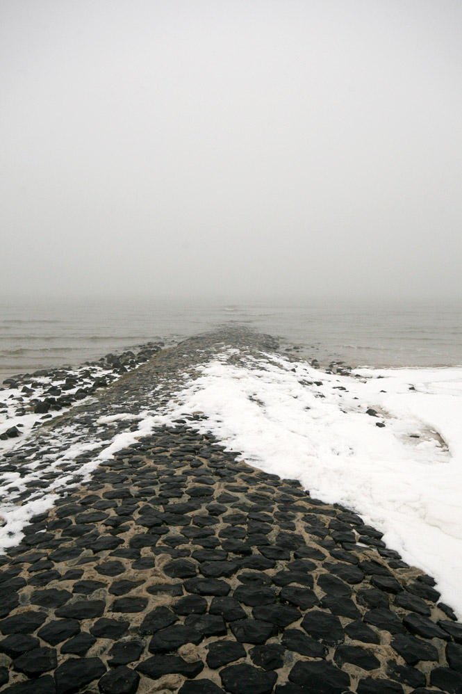 ‹ An einem kalten, nebeligen Wintertag hat der leichte Ostwind ein wenig Meereis auf die Buhne »N« treiben lassen.