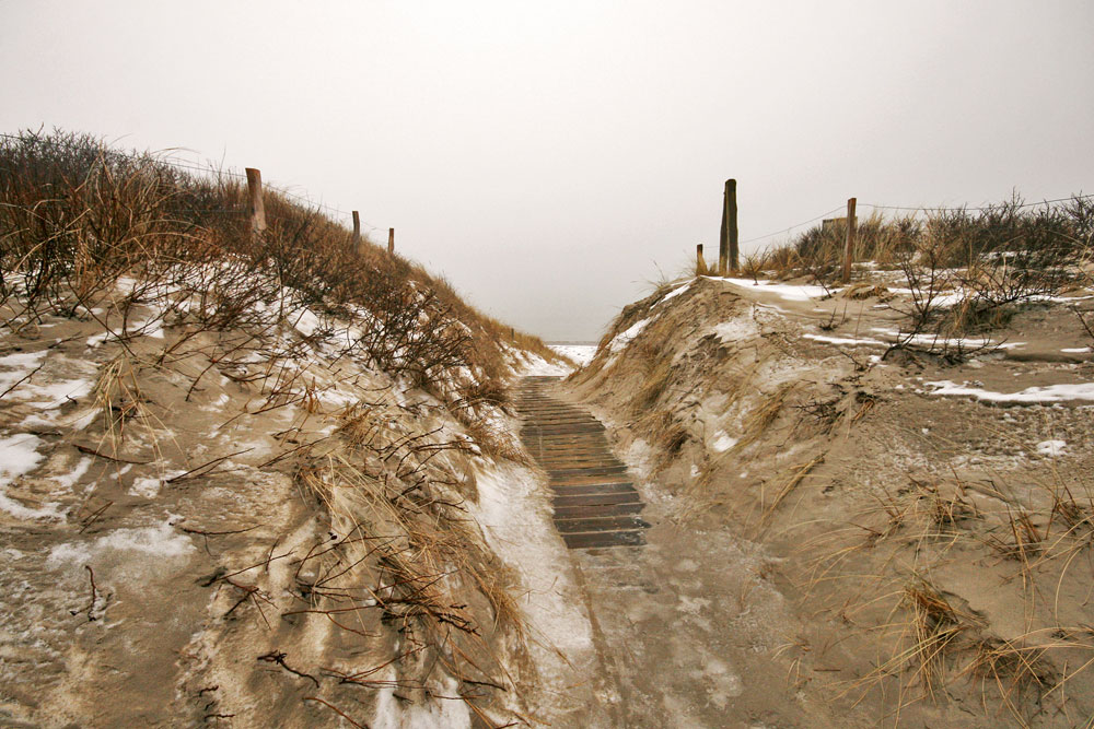 Flugsand hat sich über eine mehr oder weniger geschlossene Schneedecke gelegt, an einigen Stellen ist der Schnee aber weiterhin erkennbar. Ansonsten entstand das Bild an einem äußerst unangenehm-kalten Tag im Spätwinter.