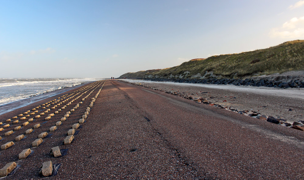 Wir sind zum Nordwest-Längswerk hinuntergestiegen, das sich zwischen dem hochwasserfreien Strand und den Nordwestdünen befindet.
