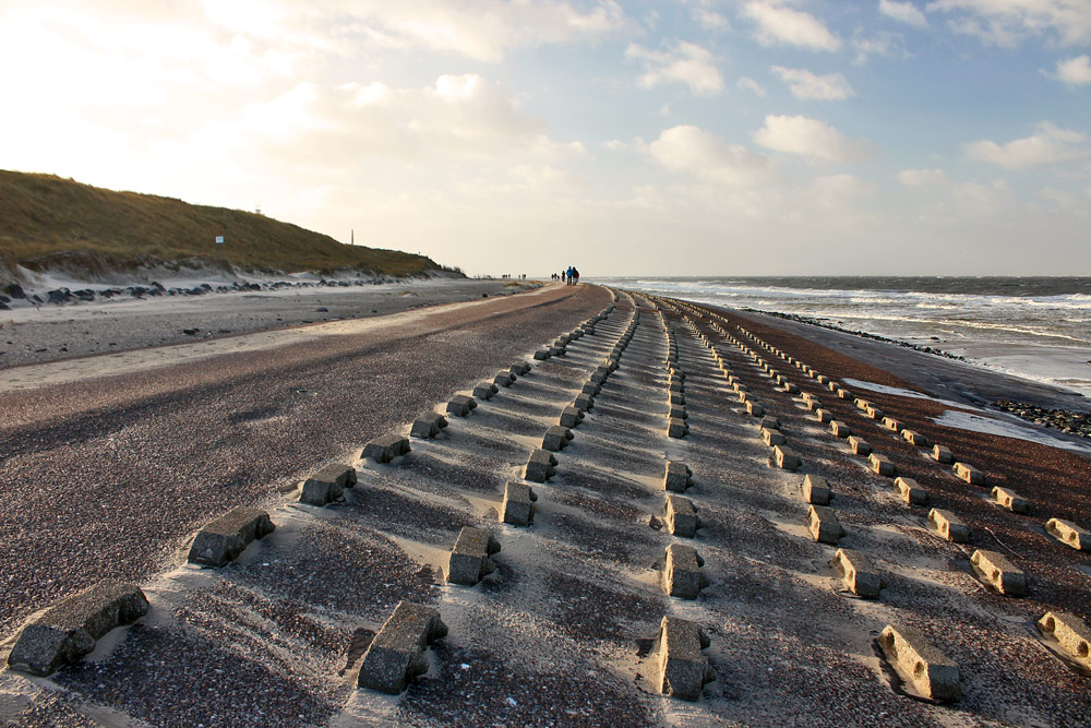 Die Wellenbrecher werfen aufgrund des tiefen Winter-Sonnenstandes lange Schatten. Zahlreiche Spaziergänger sind hier unterwegs und genießen den windigen, aber tollen Tag.
