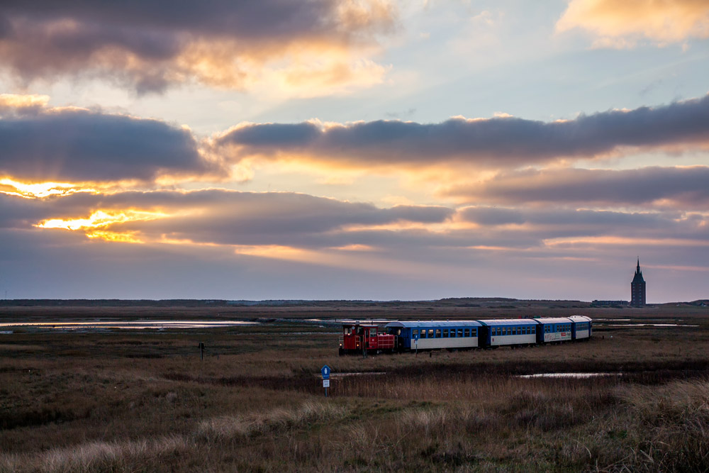 Der mit der Lok »399 108-0« bespannte Personenzug der Inselbahn durchquert hier gerade die Ruhezone des Nationalparks. Im Hintergrund ist der Westturm zu erkennen.