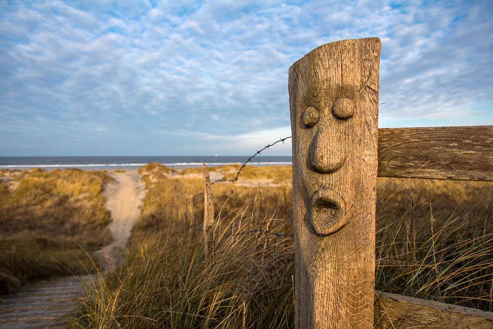 Ein Pfahl begrüßt uns an einer Dünenüberwegung im Osten der Insel. Nach rechts gelangt man auf eine Aussichtsplattform (leider nicht im Bild).