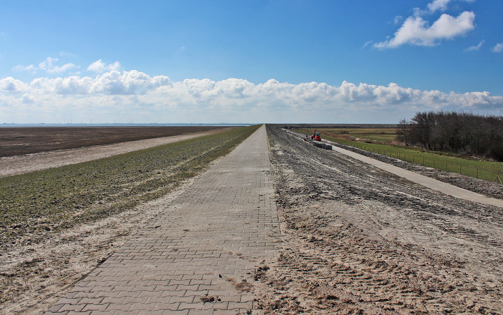 Hier ein weiterer Blick auf den kürzlich erhöhten Ostgrodendeich. Es wurden sowohl ein Weg auf der Deichkrone als auch ein neuer Deichverteidigungsweg angelegt. Letzterer ist rechts zu sehen und noch nicht komplett gepflastert.