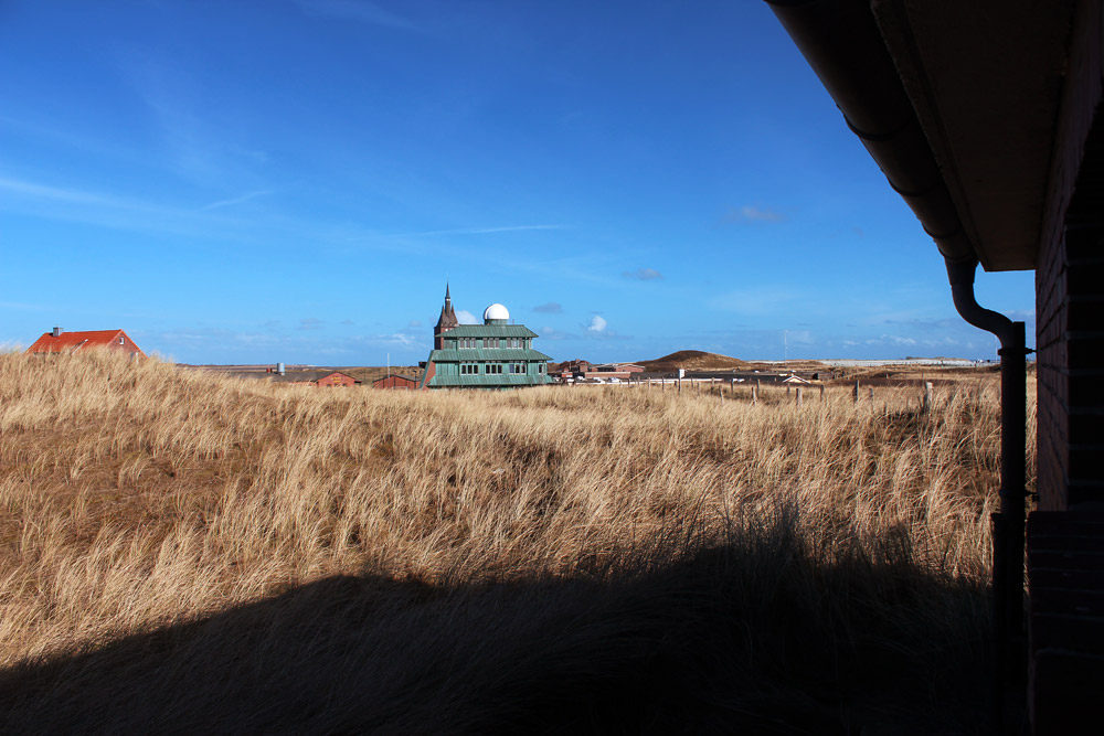 Hier wagen wir einen Blick aus einem Fenster des Westbad-Toilettenhäuschens. Man hat einen guten Blick über die Dünen und das Westdorf mit dem »Inselheim Rüstingen« und dem Westturm.