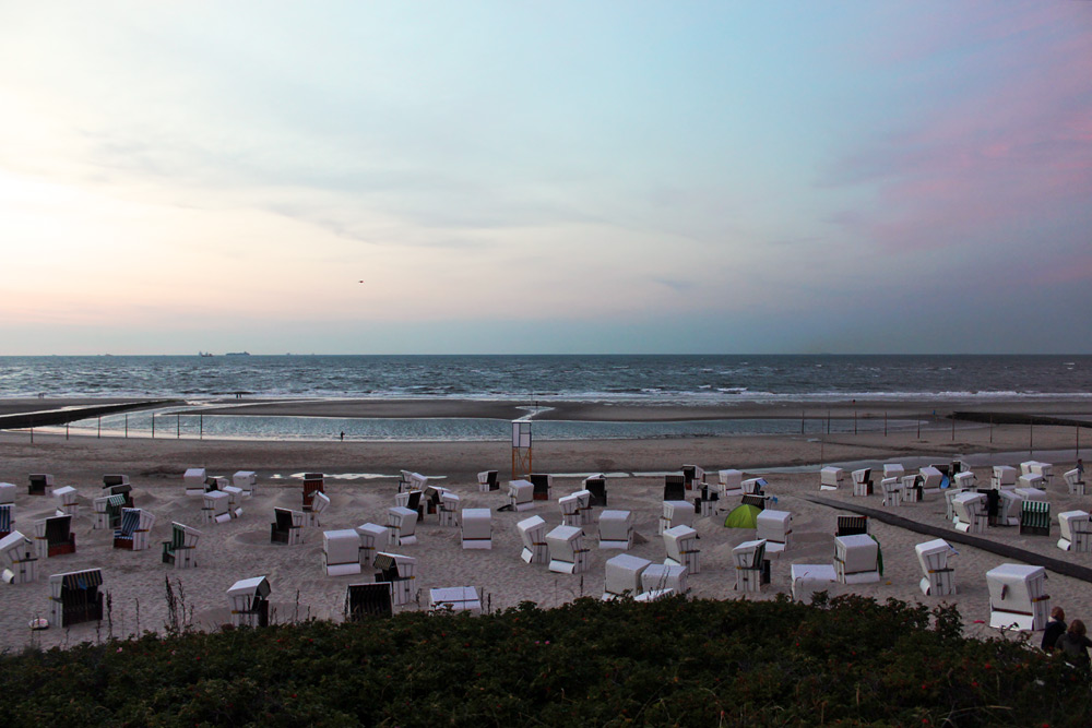 Hier der Hauptstrand kurz nach Sonnenuntergang. Mitten im Badefeld befand sich 2014 ein langgezogener Priel, dahinter eine Sandbank. Beides wirkt sich bei Hochwasser selbstverständlich auf den Wellenschlag aus.