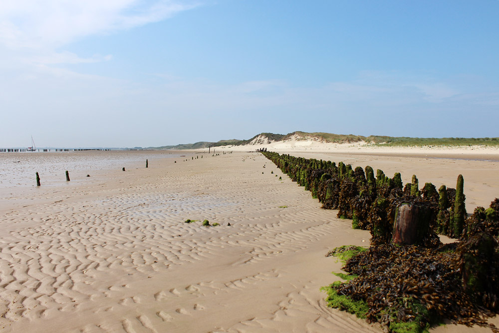 Wir befinden uns gleich am Ostanleger und blicken zurück in Richtung Ostdünen. Rechts ist eine Reihe verwitterter Pfähle zu sehen.