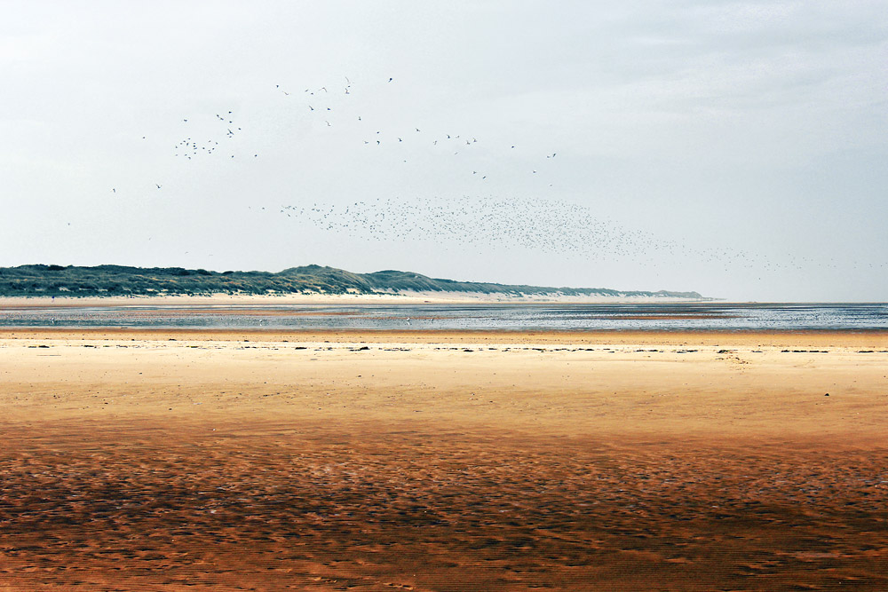 Ein Vogelschwarm überfliegt hier gerade die Ostdünen, im Vordergrund der weite Oststrand.