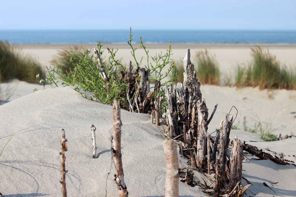 Von einigen Buschzäunen, die von den Mitarbeitern des »Wasser- und Schiffahrtsamts« gesetzt wurden, sind nach Jahren des Sandfangens nur noch versandete und mit Meersenf bewachsene Fragmente übrig, beispielsweise hier an dieser Dünenüberwegung.