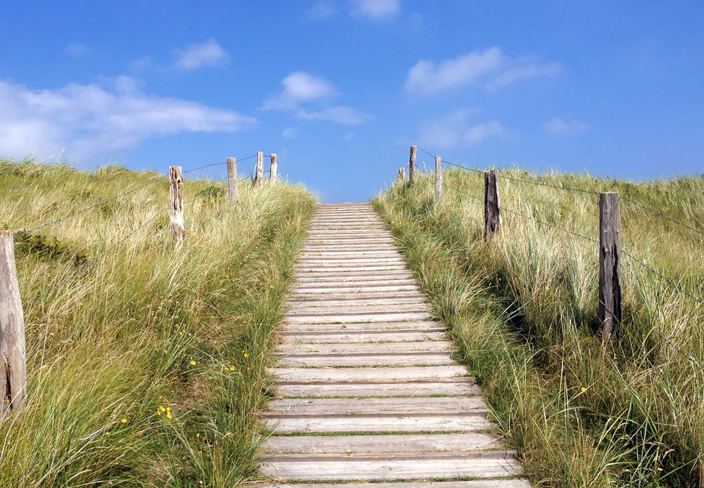 Hier sehen wir eine typische Überwegung, an der man die Dünen bequem – und außerdem ohne den Dünenschutz zu gefährden – überqueren kann.