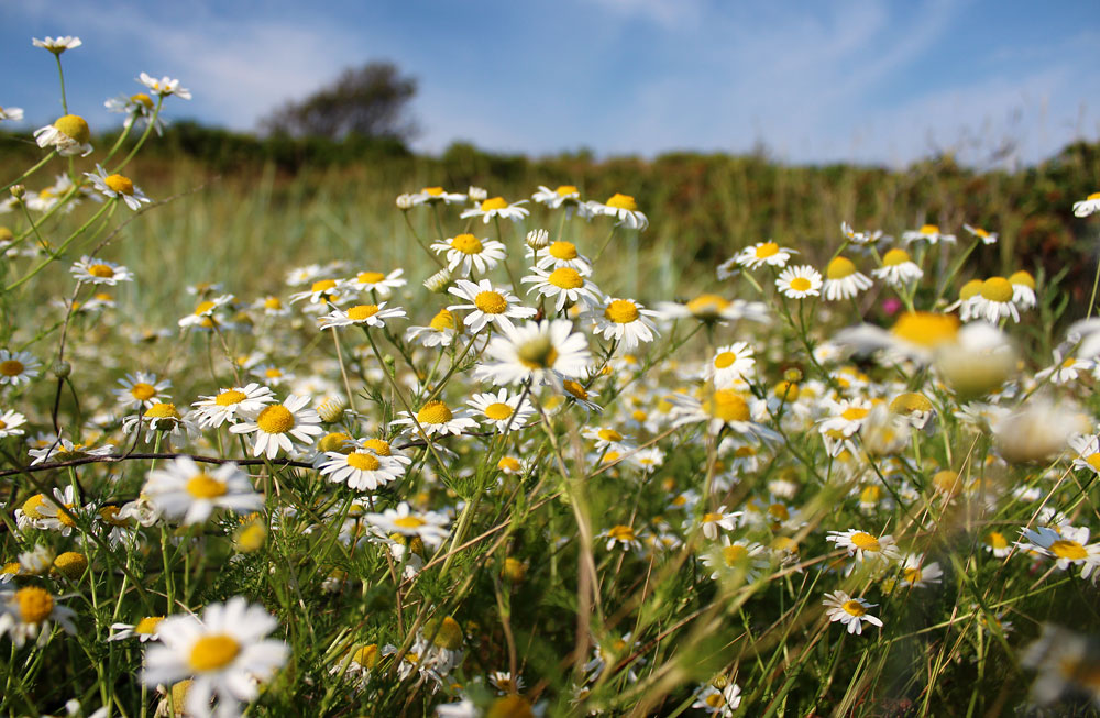 Jede Menge Kamille wächst und blüht entlang der Salzwiesen im Osten der Insel, etwa auf Höhe des Kiefernwäldchens.