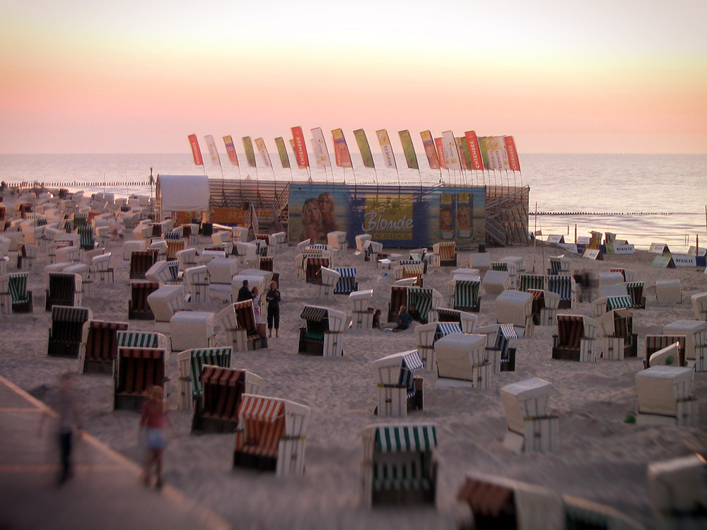 Bis 2005 fand auf Wangerooge jahrelang das legendäre Beachvolleyball-Turnier statt. Dieses Foto entstand am Freitagabend, wir blicken auf das Westfeld mit Center Court.