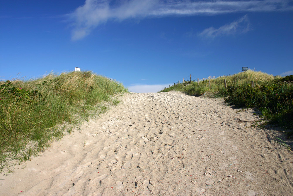 Es hat kürzlich erst geregnet, der Sand ist noch feucht. Hier geht es hinüber zum Westdeckwerk.
