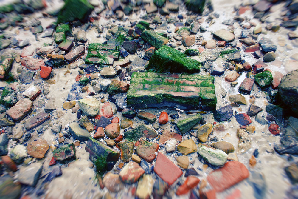 Ein Sammelsurium diverser Steine ist am Weststrand, rund um die Westturm-Buhne »B« herum, zu entdecken. Die noch immer mit Mörtel verbundenen Klinkersteine gehören mit ziemlicher Sicherheit zur ehemaligen Strandmauer, die bei der Sturmflut 1962 zerstört wurde, bei vielen anderen Steinen kann man höchstens mutmaßen.