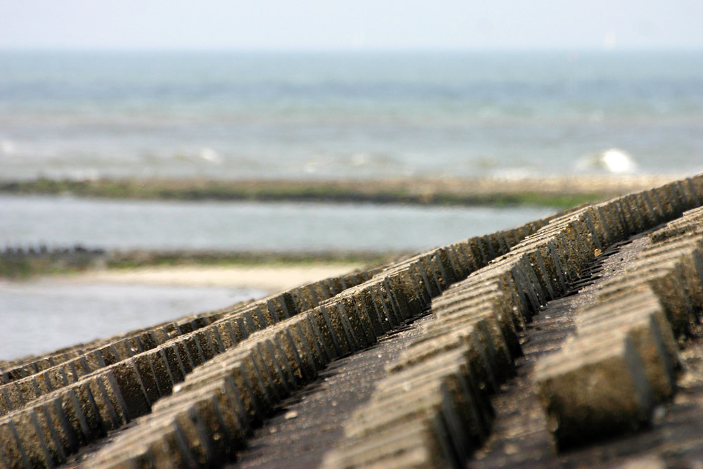 Unzähliche Quader aus Beton wurden in regelmäßigen Abständen auf dem Deckwerk befestigt, die dienen als Wellenbrecher.