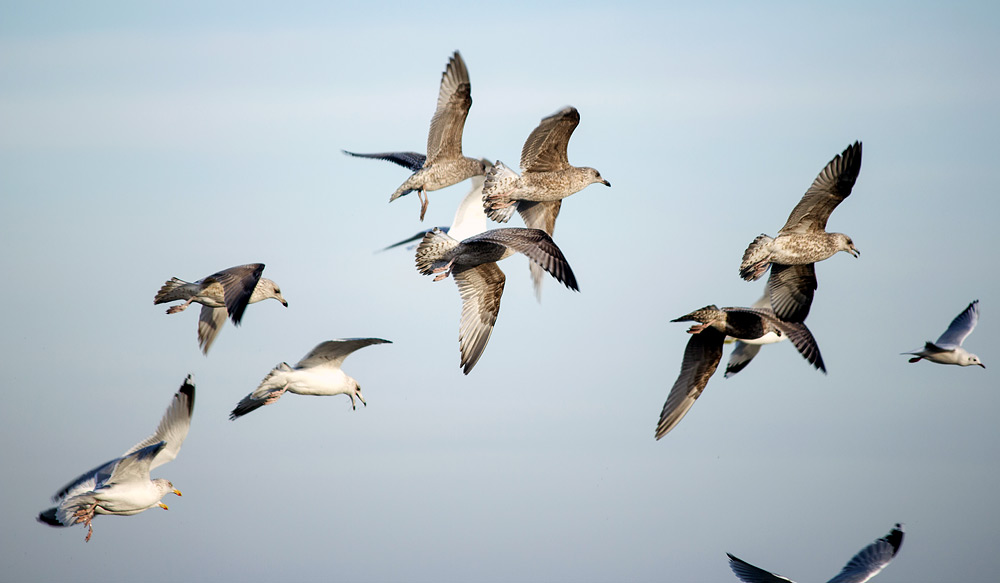 Kreischend zieht ein ganzer Möwenschwarm vorüber. Bei den braun-gefiederten Tieren handelt es sich übrigens um Jungtiere.