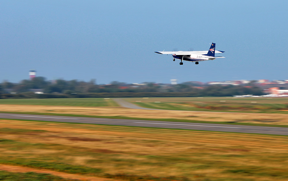 Eine »Britten-Norman BN-2 Islander« der »FLN« (Kennung »D-IEST«) hat soeben von der Startbahn abgehoben, sie ist nun wieder auf dem Weg zurück nach Harlesiel.