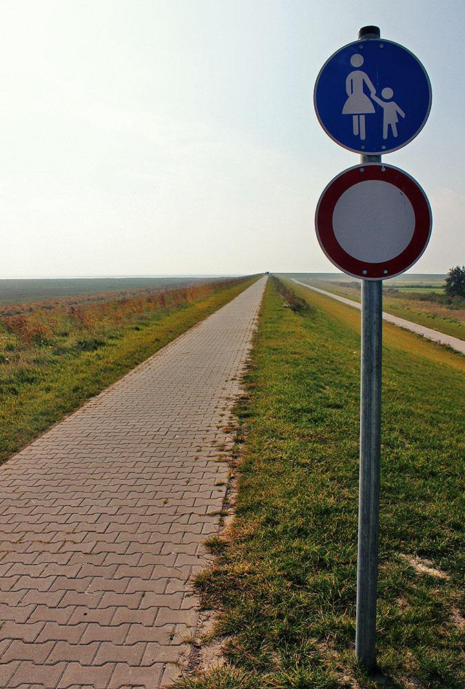 ‹ Wir befinden uns am »Neudeich« und blicken auf den erst kürzlich fertiggestellten Ostgrodendeich. Bislang ist das Befahren des Deiches nicht gestattet, der Weg auf der Deichkrone ist lediglich Fußgängern vorbehalten.