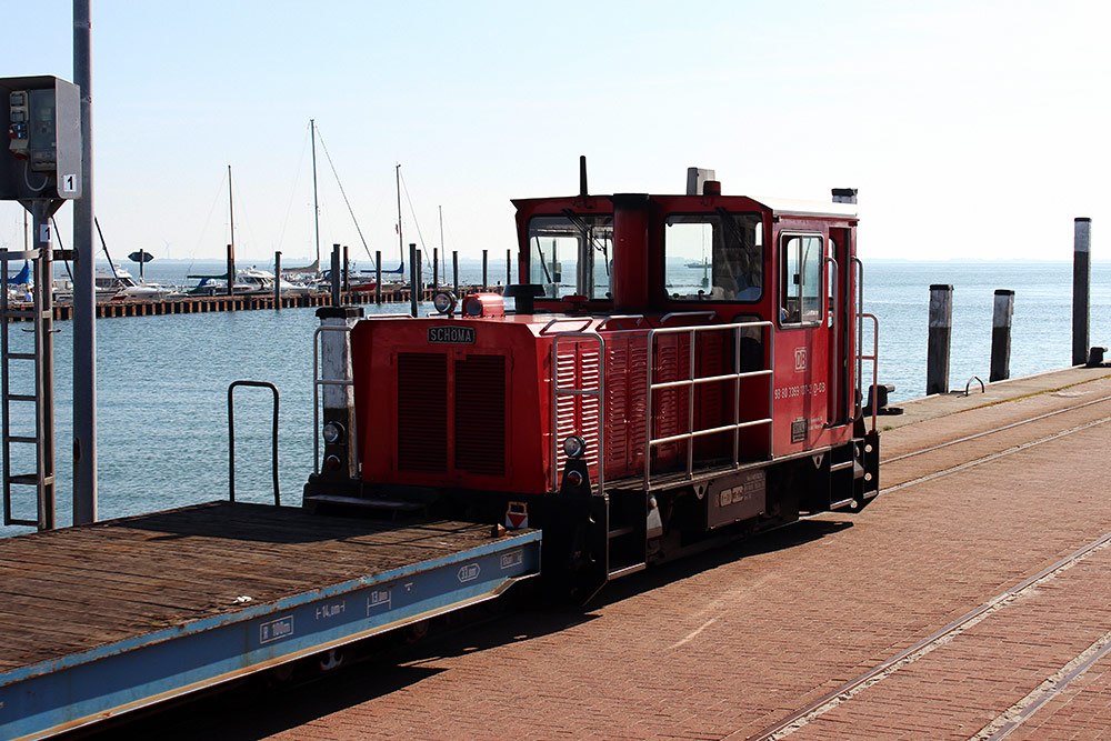 Die Lok »399 107-2« fährt am Westanleger vorüber, der Zug bringt abreisende Gäste zum Schiff.