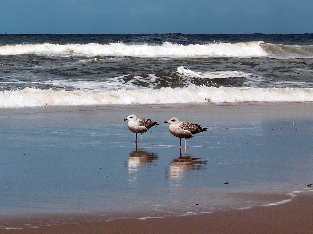Zwei Möwen-Jungtiere am Wangerooger Strand, ihr jugendliches Alter ist am bräunlichen Kleid zu erkennen.