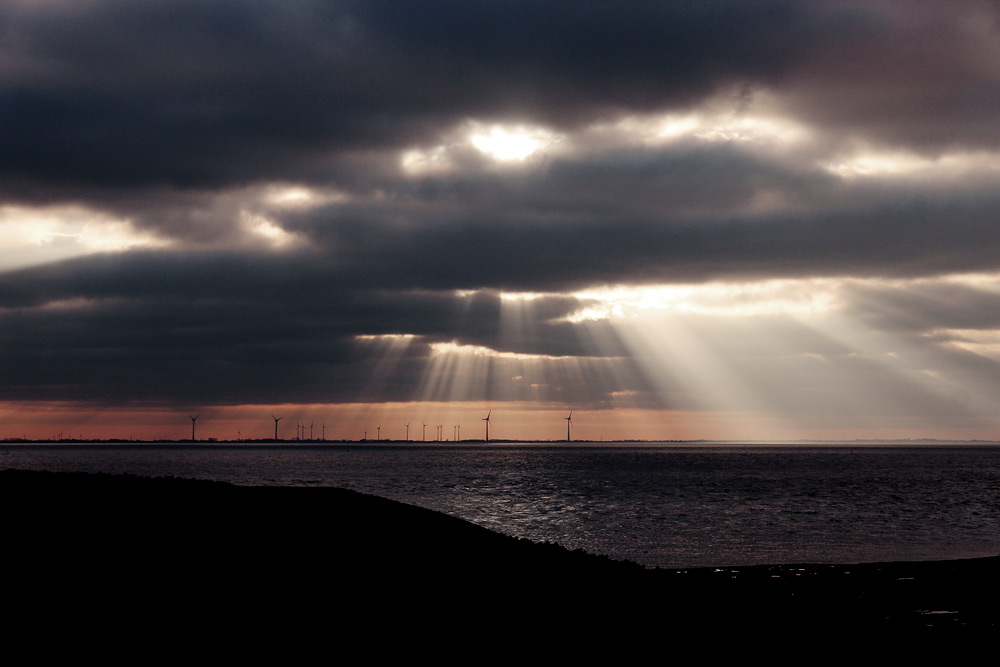 Die Sonne bahnt sich ihren Weg durch die Wolken, doch der größte Teil des Himmels ist von dunklen Wolken bedeckt. Vor uns die »Harle« bzw. die »Dove Harle«, die zwischen Wangerooge und Spiekeroog verlaufen, im Hintergrund das ostfriesische Festland mit seinen zahlreichen Windrädern.