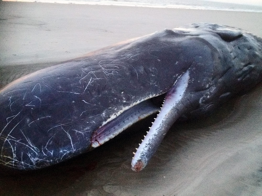 Hier sehen wir noch einmal das Gebiß, das zu einem der beiden 12 bzw. 13 Meter langen Pottwale gehört, die Anfang Januar am Wangerooger Osteert gestrandet sind. Der Unterkiefer wurde später entfernt, um räuberischen Elfenbeinjägern keine Beute zu ermöglichen.