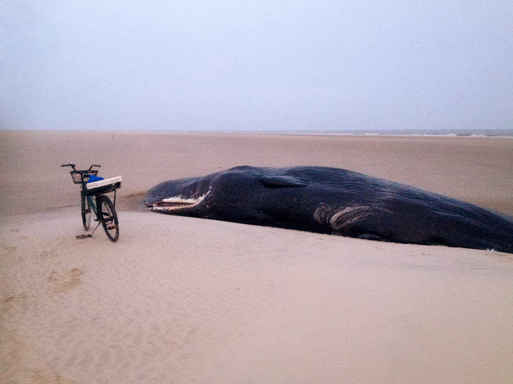 Durch das Fahrrad können wir uns eine vage Vorstellung der Pottwal-Größe machen. Die beiden jungen Wale waren 12 bzw. 13 Meter lang.
