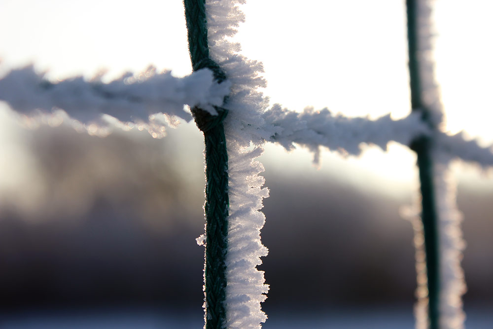Bei Nebel und äußerst kalten Temperaturen hat sich im Laufe des vorangegangenen Tages Rauhreif gebildet. Hier die Nahaufnahme eines Tornetzes, das von einer Seite mit feinsten Eisstrukturen besetzt ist.