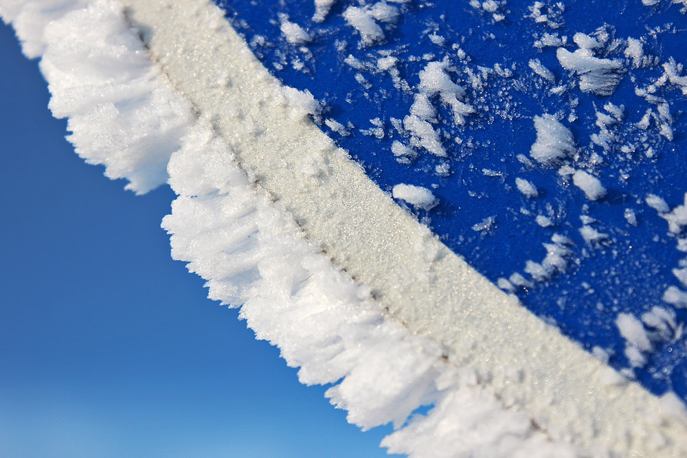 In Luv-Richtung hat sich eine ganz ordentliche Reifschicht am Verkehrszeichen auf dem Deich gebildet.