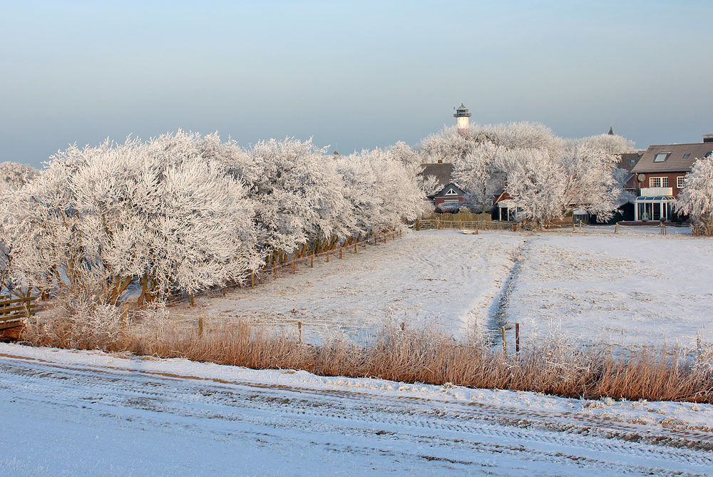 Die Deichschutzzone darf nicht bebaut werden, stattdessen befinden sich dort Pferdeweiden und der Deichgraben. Den »Fußweg zum Deich« links im Bild erkennt man hauptsächlich an den am Wegesrand wachsenden Bäumen.
