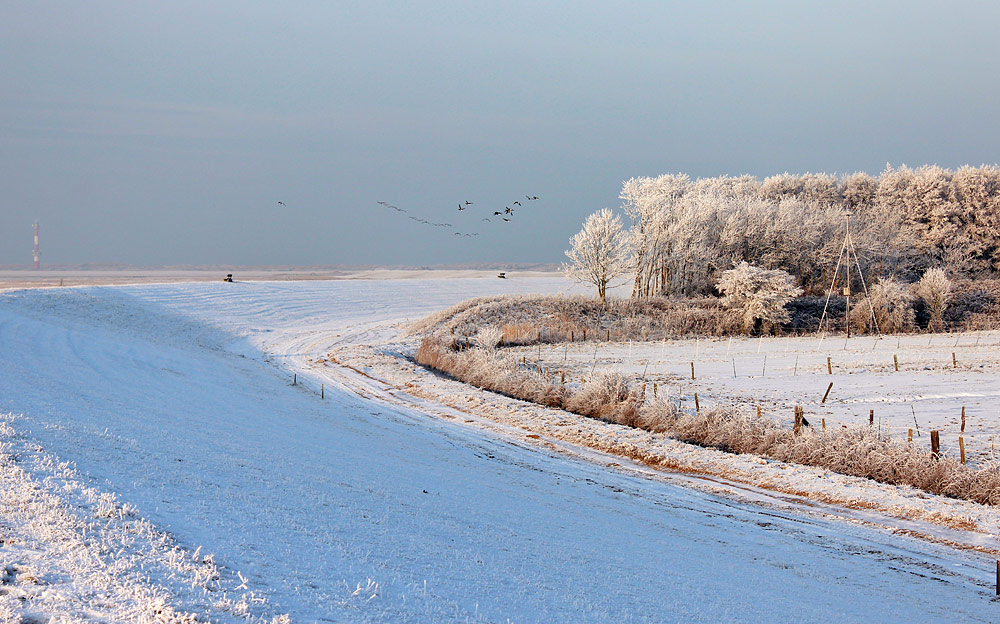 Wir befinden uns noch immer auf der Krone des Dorfgrodendeichs. Rechts erkennt man einen Mast mit Sirene, dahinter verläuft der ehemalige Deich, der deutlich niedriger als der verschneite Seedeich links im Bild ist.