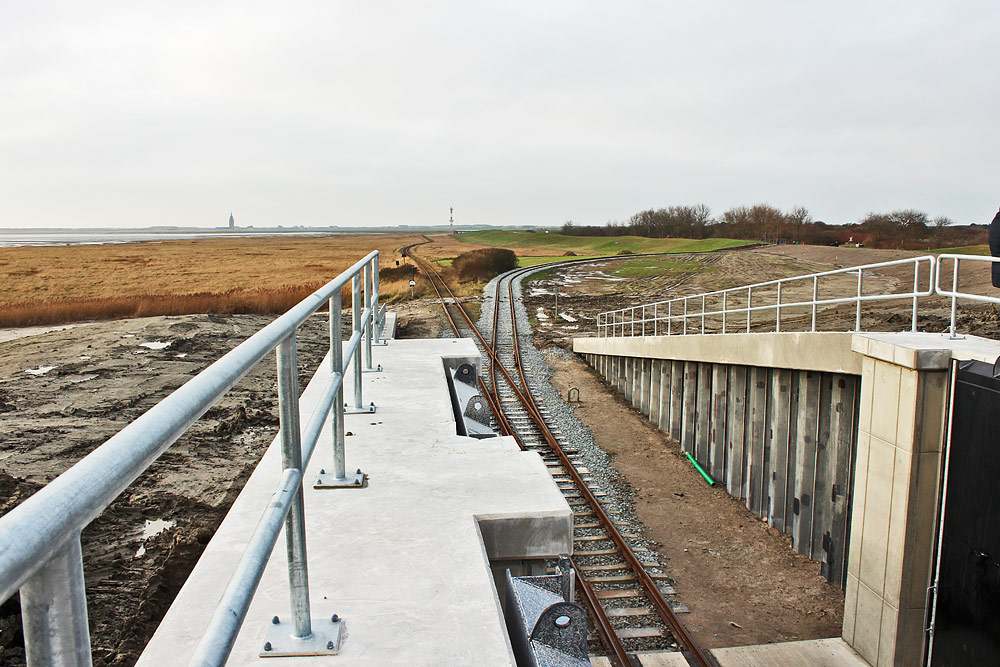 In einigen Minuten wird ein Zug das Deichschart passieren, in der Ferne ist er bereits zu erahnen. Rechts zweigt die private Stichstrecke zur Müllpreßanlage ab, die Strecke erhielt erst kürzlich neue Schotter.